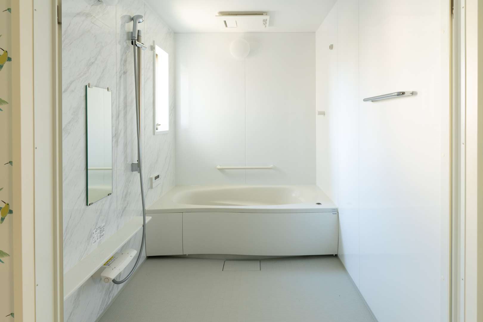 ナチュラルテイストなデザインが好みとのことでしたので、壁には白いタイルを使用し、床には木目調のタイルを使用し、シャワーヘッドは壁に取り付けられ、天然石のようなデザインの壁掛けシャワーを使用しました。
